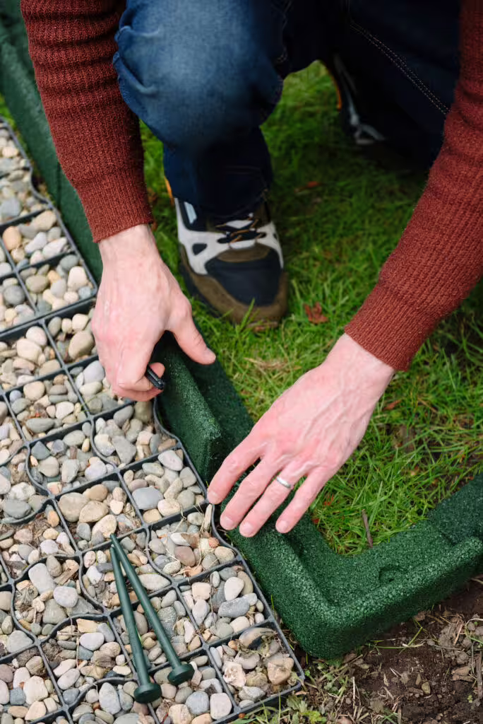 Dies ist ein wichtiger Schritt, damit Sie die Abgrenzung genau dort verlegen können, wo Sie es planen. Jeder Abschnitt der Umrandung ist 8 cm breit und 8 cm tief, so dass Sie eine Vorstellung davon bekommen, wie tief Sie in den Boden graben müssen. Oder platzieren Sie die Umrandung einfach an der gewünschten Stelle und befestigen Sie sie mit den mitgelieferten farbcodierten Stiften.